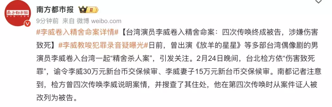 曾出演《放羊的星星》、《海派甜心》等偶像剧的台湾省演员李威,退圈后便修习“佛法”,在今年一月份,台媒曝出李威卷入一起命案,当时李威作为证人被传唤了3次,直到案件最新进展曝光,李威与命案有着直接关系!